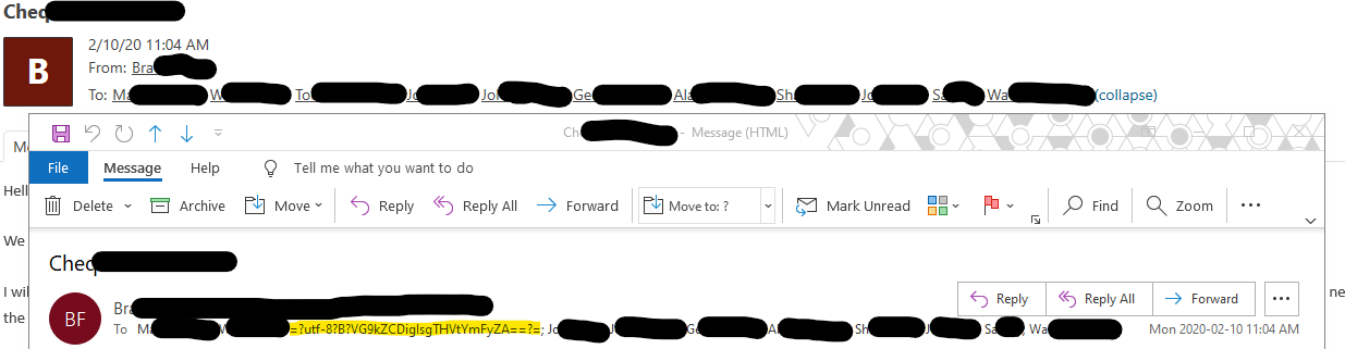 This screenshot is the webmail in the background showing a recipient list where each name appears fine (ie in English), and in the foreground is the same message in Outlook - with one of the recipients all garbled...