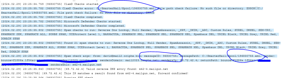 [2024.02.29] 00:01:00.796 [8034113 ClamD Checks error: s:/SmarterMail/Spool/SubSpool4/8034113.eml: File path check failure: No such file or directory. ERRORs:/SmarterMail/Spool/SubSpool4/8034113.eml: File path check failure: No such file or directory. ERROR