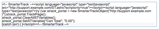In the example script below, the Who's On tracking script has been edited to create a custom variable called "Shopping Cart." The tracking script is generated automatically by the Who's On settings page in SmarterTrack. The object "strack_portal" is what is used to communicate with the SmarterTrack server and for it to track all current information about your visitor. Custom variables are also set through the use of this tracking object. NOTE: All custom variables must be set after strack_portal.TrackPage(); in your tracking script.